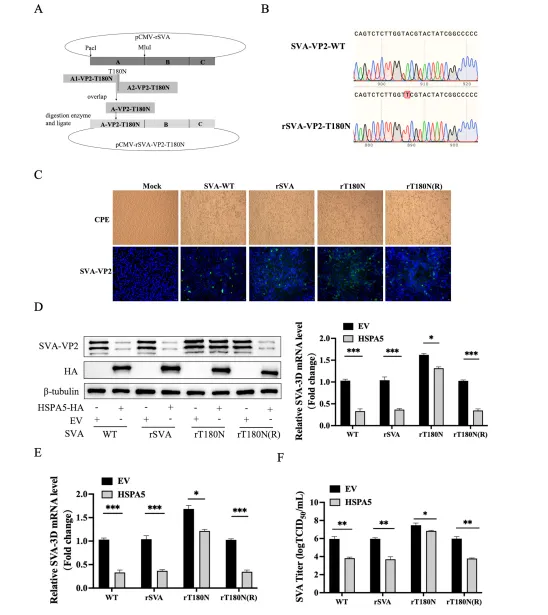 为验证体内意义,团队利用反向遗传学技术,以pCMV-rSVA为骨架构建携带VP2 T180N突变的感染性克隆,并拯救出rT180N病毒及修复病毒rT180N(R)。免疫荧光和测序确认病毒成功拯救。在HSPA5过表达的BHK-21细胞中,野生型SVA、rSVA及rT180N(R)复制均被显著抑制,而rT180N病毒的VP2蛋白、RNA水平及滴度抑制效果明显减弱,表明T180N突变赋予病毒对HSPA5抗病毒活性的抵抗能力。
