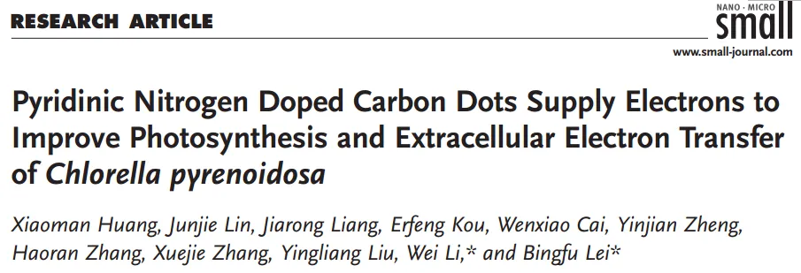 英文题目:Pyridinic Nitrogen Doped Carbon Dots Supply Electrons to Improve Photosynthesis and Extracellular Electron Transfer of Chlorella pyrenoidosa