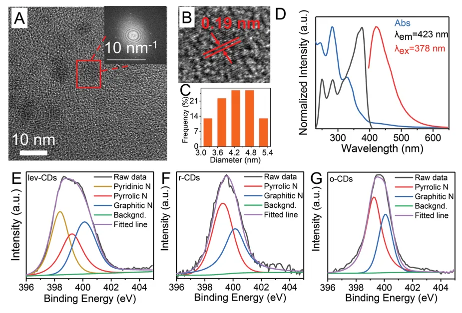 lev-CDs是平均直径约为4.2 nm的典型微球颗粒。HRTEM图像显示lev-CDs具有0.19 nm的面间距,与石墨的基底间距相对应。lev-CDs的晶体结构通过选区电子衍射(SAED)(图2A)确认。lev-CDs的光学性质如图2D所示。在紫外-可见光谱中,246和282 nm处的尖锐吸收峰可能分别属于表面有机基团C=C和C=O,而334 nm处的吸收峰对应于碳化过程中共轭氮杂环结构的π-π*。同时,lev-CDs在378 nm激发下也在423 nm处显示出最大荧光强度。