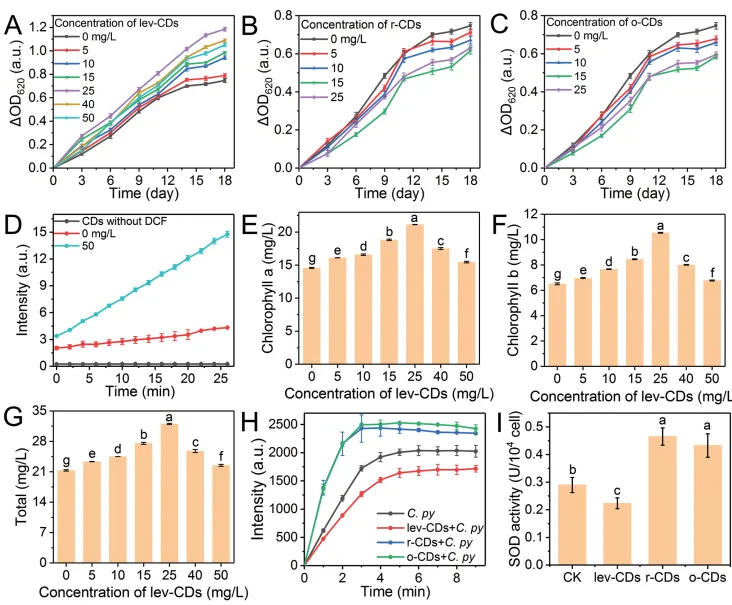 图3.C.pyrenoidosa和用不同浓度的A:lev-CDs、B:r-CDs和C:o-CDs培养下的C.pyrenoidosa的生长曲线,D:在照明下,有无50 mg L−1 lev-CDs的DCF的荧光强度,C.pyrenoidosa和用不同浓度的lev-CDs(5、10、15、25、40和50 mg L-1)处理C.pyrenoidosa后E:叶绿素a含量,F:叶绿素B含量,G:总叶绿素含量,H:C.pyrenoidosa和用不同浓度的lev-CDs(5、10、15、25、40和50 mg L-1)处理C.pyrenoidosa的DCF,I:C.pyrenoidosa和用不同浓度的lev-CDs(5、10、15、25、40和50mg L-1)处理C.pyrenoidosa的SOD