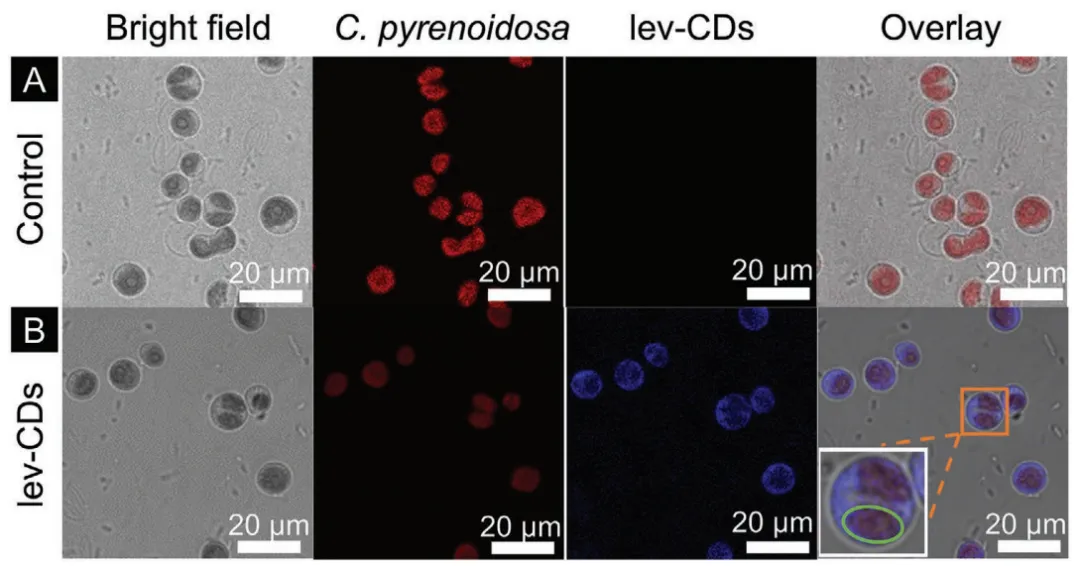 为了确认C.pyrenoidosa和lev-CDs之间的相互作用,进行共聚焦激光扫描显微镜(CLSM)表征。如图4A、B所示,在405 nm激发下,可以清楚地观察到叶绿体自发荧光的红色荧光,lev-CDs的蓝色荧光与C.pyrenoidosa的红色荧光高度重叠。根据图4B,可以在细胞的叶绿体和细胞质中发现lev-CDs,表明C.pyrenoidosa内化lev-CDs,并且lev-CDs可以与叶绿体结合。