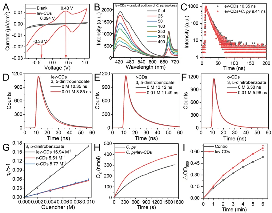 如上所述,吡啶氮是促进叶绿素积累的有效官能团,这对应于C.pyrenoidosa生物量的积累。作者假设lev-CDs作为电子供体,为C.pyrenoidosa的光系统提供电子。为了证明和更好地理解lev-CDs在电子转移过程中的作用,作者通过循环伏安法(CV)测试了lev-CDs的氧化还原电位(图5A)。根据公式(1),lev-CDs的氧化电位和还原电位分别为+0.6346和-0.1254 V(vs NHE)。如图1A所示,lev-CDs的氧化电位比P680的氧化电位更低,这表明P680+可以接受来自lev-CDs的电子,P680和P680* 之间的电位差减小,从而提高了从P680到P680* 的电子转移速率。同时,lev-CDs的还原电位比QA的还原电位更低, QA接受lev-CDs和P680* 的电子。因此,lev-CDs的光诱导电子可以转移到C.pyrenoidosa的电子传递链上。