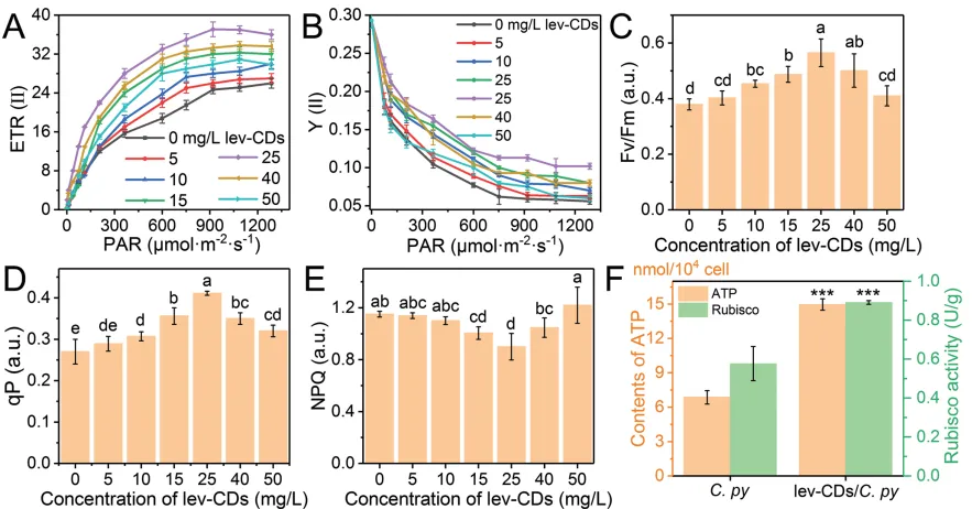 图6 A:ETR, B:Y(II),C: Fv/Fm, D:qP, E:NPQ,分别用不同浓度的lev-CDs(0、5、10、15、25、40和50 mg L−1)处理C. pyrenoidosa,F:用lev-CDs (25 mg L−1)处理C. pyrenoidosa和C. pyrenoidosa的ATP生物量及Rubisco活性