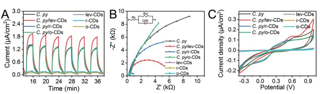作为初级单细胞生物,C.pyrenoidosa不仅进行光合作用,还在细胞与外部环境之间进行电子通信。为了研究lev-CDs对C.pyrenoidosa胞外电子转移能力的影响,作者将C.pyrenoidosa和C.pyrenoidosa/CDs配合物分别放置在碳纸上,并以C. pyrenoidosa/CDs配合物作为工作电极构建三电极体系。测量了电极的光电流响应,并测试了lev-CDs、r-CDs和o-CDs电极作为对照。如图7A所示,由于光激发,levCDs、r-CDs和o-CDs电极提供了较小的光电流(照射下的电流密度减去暗电流密度)。C.pyrenoidosa电极产生的光电流为1.30±0.05µA cm−2,表明电子在C. pyrenoidosa和电极之间发生了转移。C.pyrenoidosa/lev-CDs电极的光电流为1.82±0.06µA cm−2,是C.pyrenoidosa电极的1.5倍。C.pyrenoidosa/r-CDs电极和C.pyrenoidosa /o-CDs电极的光电流分别为1.30±0.04µA cm−2和1.31±0.04µA cm−2,与C.pyrenoidosa电极没有太大差异。综上初步证明了lev-CDs显著提高了C.pyrenoidosa电极的光电响应性能。