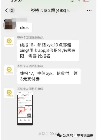 很多及时性的线报,我们都会第一时间发到卡友群,微信社群是最快最有效的传播方式。
