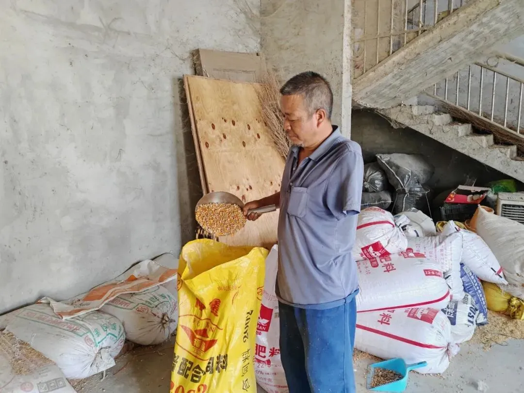 韦仕忠在准备鸡粮。(兰幸娟 摄)