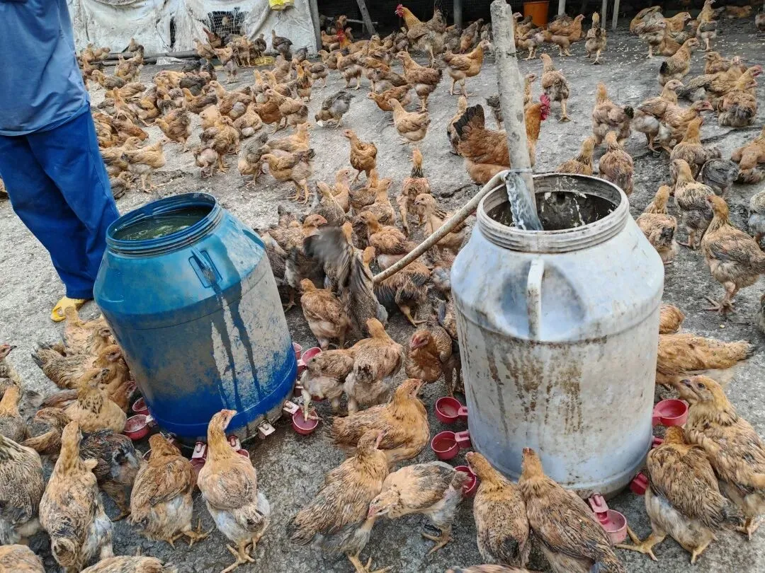 韦仕忠是当地小有名气的养鸡能手,依托桉树林天然生态优势,他探索出生态林下散养模式。目前存栏土鸡1000只,今年预计出栏1800只,养殖周期约200天,成熟土鸡由城区收购商上门收购,销路稳定。为提升养殖效率,韦仕忠结合实际创新设计半自动化饮水设备,实现无人看管时鸡群正常饮水,大幅降低人工成本;同时坚持科学养殖,定期赴柳州、宜州等地学习先进养殖技术,优化饲养管理,保障土鸡品质。