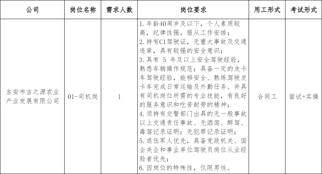吉安市农业农村发展集团有限公司(简称“市农发集团”)是吉安市政府直属、市国资委监管的国有独资企业,定位为市级农业产业化平台和全市农业“链主”企业。集团聚焦“井冈山”品牌建设运营发展、粮油收储保供、乡村建设与运营、优质农产品种养加工、农业科技和装备支撑服务等业务,致力于推动农业农村高质量发展和农业强市建设。根据工作需要,面向社会公开招聘司机1名。现将有关事项公告如下: