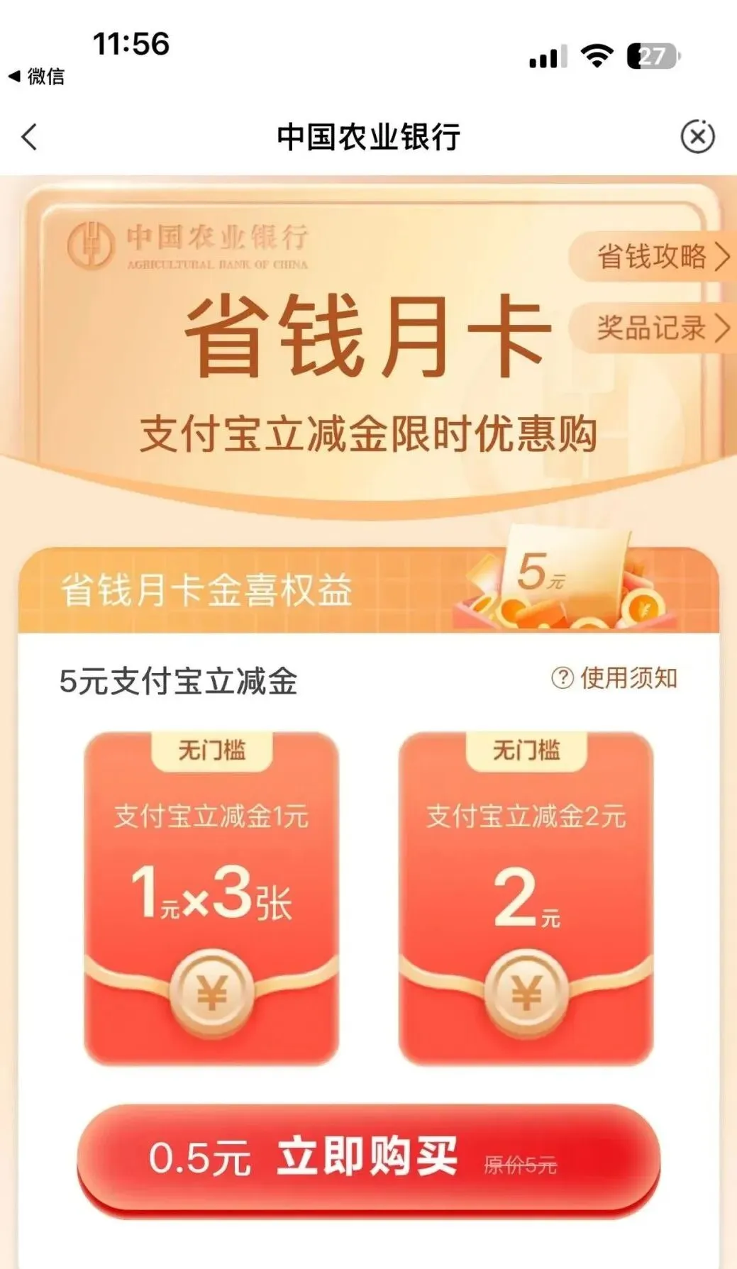 4月农行5元无门槛省钱月卡(自测1分购)