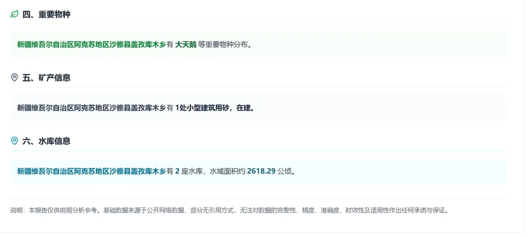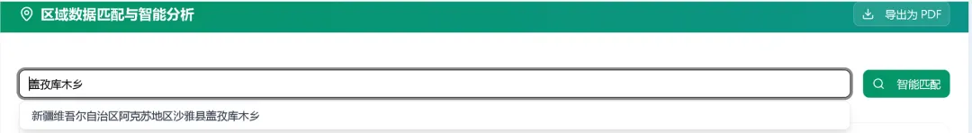 该模块集成了全国范围内的包括农业区划、第七次人口普查数据、土壤、生物分布、矿产地、水库等数据,通过简单的名称输入即可自动匹配相关数据。所有数据均为系统内置,根据输入提供精准匹配结果。