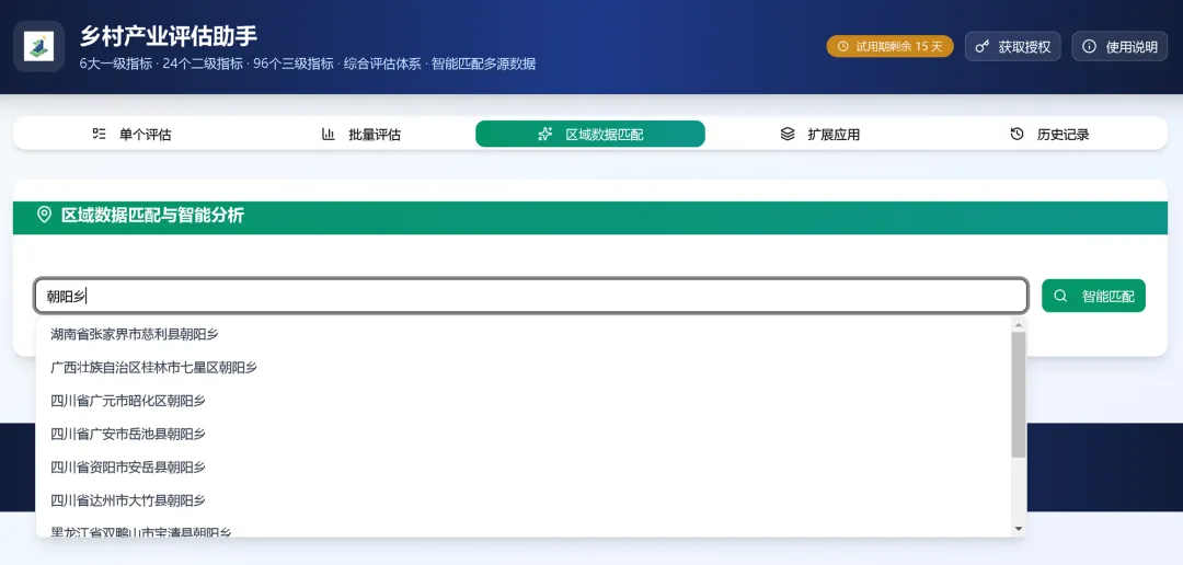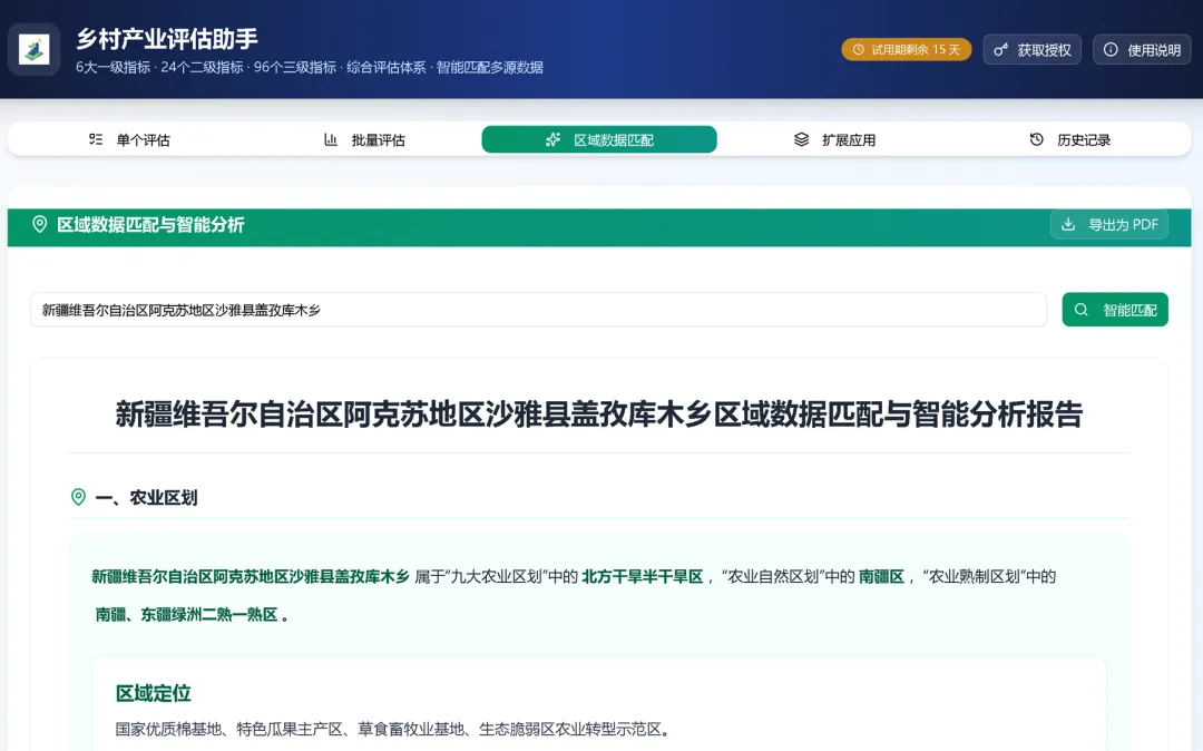 乡村产业评估助手有个“区域数据匹配”的功能,在全域土整项目或咨询研究项目前期可以提供快速技术支持,匹配多源数据(后续还会增加其他数据源),大大加快加深对目标乡镇的了解。