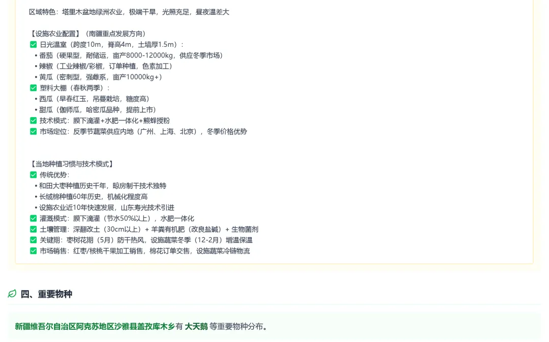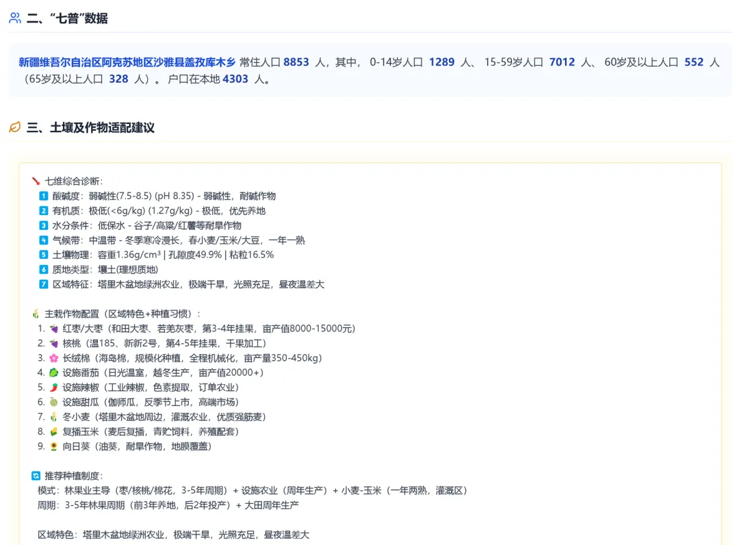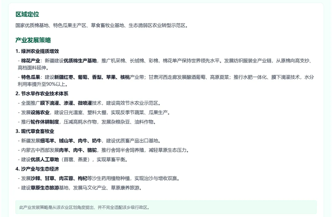 一、农业区划:展示该乡镇所属的九大农业区划、农业自然区划及农业熟制区划。若匹配到九大区划,系统还会一并输出对应农业区划的“区域定位”和“产业发展策略”。