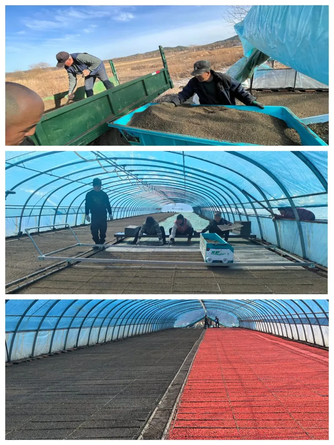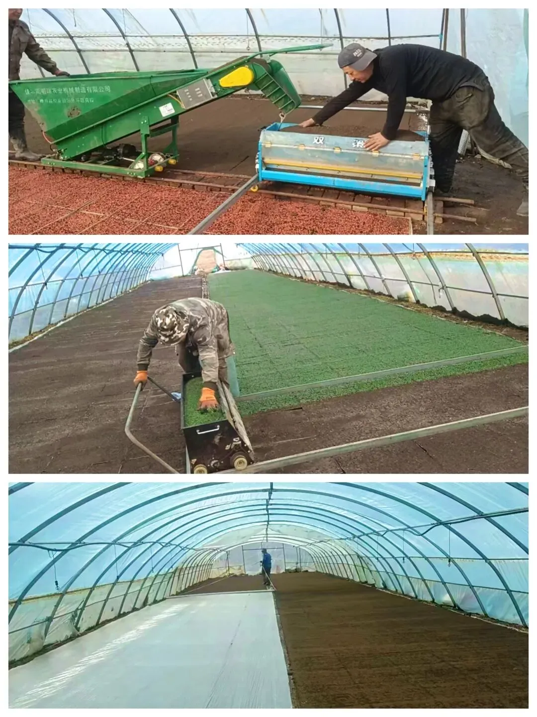 在双丰村向荣屯的育秧大棚内,种粮大户熟练进行床土筛选、秧盘摆放、覆土压实等工序,确保床面平整、土质细碎、秧盘衔接紧密、横平竖直,实现“摆一栋、成一栋、达标一栋”。