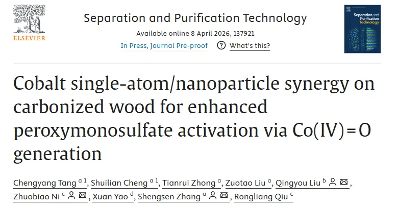 华南农业大学等Sep. Purif. Technol. | 碳化木负载钴单原子与纳米颗粒协同突破“氧墙”效应高效活化过一硫酸盐
