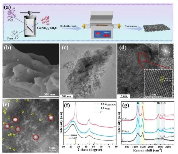 作者以具有三维多孔结构的废弃松木片为前驱体,在经过去除木质素和半纤维素的预处理后,将聚乙烯吡咯烷酮、硝酸钴和尿素的混合溶液通过水热反应浸渍到木材孔道中,随后在850摄氏度的氮气氛围下进行高温煅烧,成功构筑了碳化木负载的钴单原子/纳米颗粒复合材料CCoSACs-NPs。与传统的粉末状碳基单原子催化剂相比,该策略的新颖之处在于实现了无粘结剂的宏观块体成型,同时利用尿素热解促进石墨化和氮掺杂,在单一碳骨架上原位实现了单原子钴与金属纳米颗粒的紧密空间分布与电子耦合。