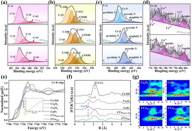 高角环形暗场扫描透射电子显微镜直接观察到了金属单原子与纳米颗粒簇在材料内部的共存状态。扩展X射线吸收精细结构光谱提供了最关键的局域配位表征证据:在复合材料的光谱中同时观察到了位于1.46埃处的钴-氮配位单原子特征峰以及位于2.28埃处的钴-钴金属键特征峰;而对比样品CCoNPs仅表现出钴-钴键信号。拉曼光谱测得复合材料具有高达1.75的特征峰强度比值,结合X射线光电子能谱分析,这些表征准确地证明了材料中成功构筑了高度石墨化的长程共轭碳网络,且钴前驱体被含氮官能团有效锚定,形成了单原子与金属纳米团簇并存的双位点结构。