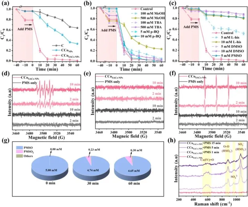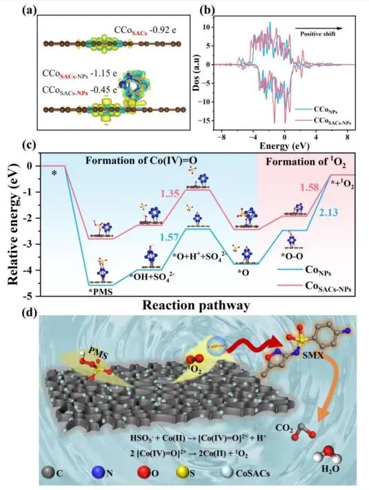 作者结合多重淬灭实验、原位光谱和密度泛函理论计算全面揭示了该体系的非自由基主导机理。在直接实验验证方面,加入甲醇和叔丁醇对反应几乎无抑制作用,电子顺磁共振也未检测到羟基和硫酸根自由基,直接排除了自由基路径;利用L-组氨酸淬灭结合特征光谱确切证实了单线态氧的生成;通过甲基苯基亚砜探针高选择性地生成了特定的砜类氧化产物,同时原位拉曼光谱在582 cm-1处实时捕获到了中间体振动信号,从实验上直接证实了Co(IV)=O物种的产生。基于此,理论计算给出了微观电荷转移推断:差分电荷密度和Bader电荷分析表明,引入纳米颗粒后,单原子钴的失电子数从0.92增加到1.15,说明纳米颗粒作为受体抽走了单原子上的部分电子。这种电子密度的降低使过一硫酸盐裂解生成Co(IV)=O的吉布斯自由能从1.57 eV显著降低至1.35 eV,从理论上合理推断出双位点间的电子耦合协同降低了反应能垒。