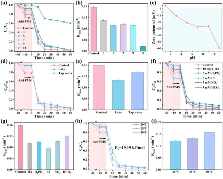 在包含20 mg/L磺胺甲恶唑和1 mM过一硫酸盐的反应体系中,CCoSACs-NPs在60分钟内实现了大于99.5%的污染物去除,其反应速率常数达到0.159 min-1。作为对比,在相同条件下,仅含钴纳米颗粒的CCoNPs和纯碳载体的去除率仅为67%和37%。在抗干扰与实用性测试中,该材料在pH值为3至9的宽泛范围内均保持了优异的催化性能,且在真实的自来水和湖水基质中依然保持了快速的降解速率。经过五次连续的吸附-降解循环后,材料对污染物的去除率仍维持在65%以上,展现出良好的结构稳定性和易回收优势。