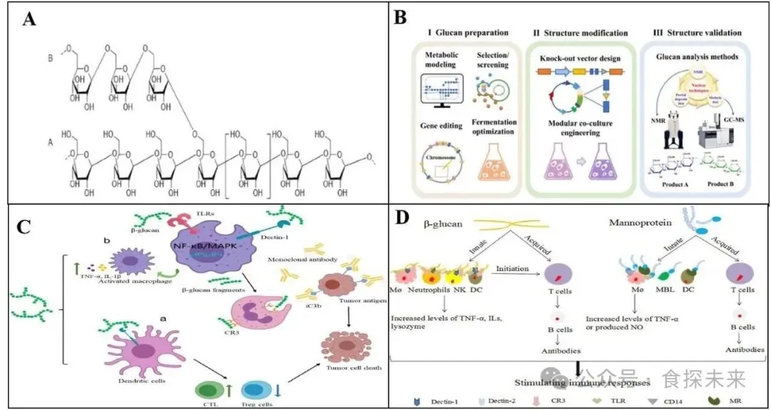 Fig. 2. (A) Primary structure of β-glucan. A. main chain: β-(1 → 3)-glucan; B. side chain: β-(1 → 6)-glucan (Wu et al., 2023); (B) The preparation engineering strategies of target glucan (J.-J. Liu et al., 2024); (C) β-glucan exerts immunomodulatory and antitumor effects through various pathways(Wang et al., 2025); (D) The immune-modulatory mechanisms of β-glucans and mannans (Y. Liu et al., 2021b).