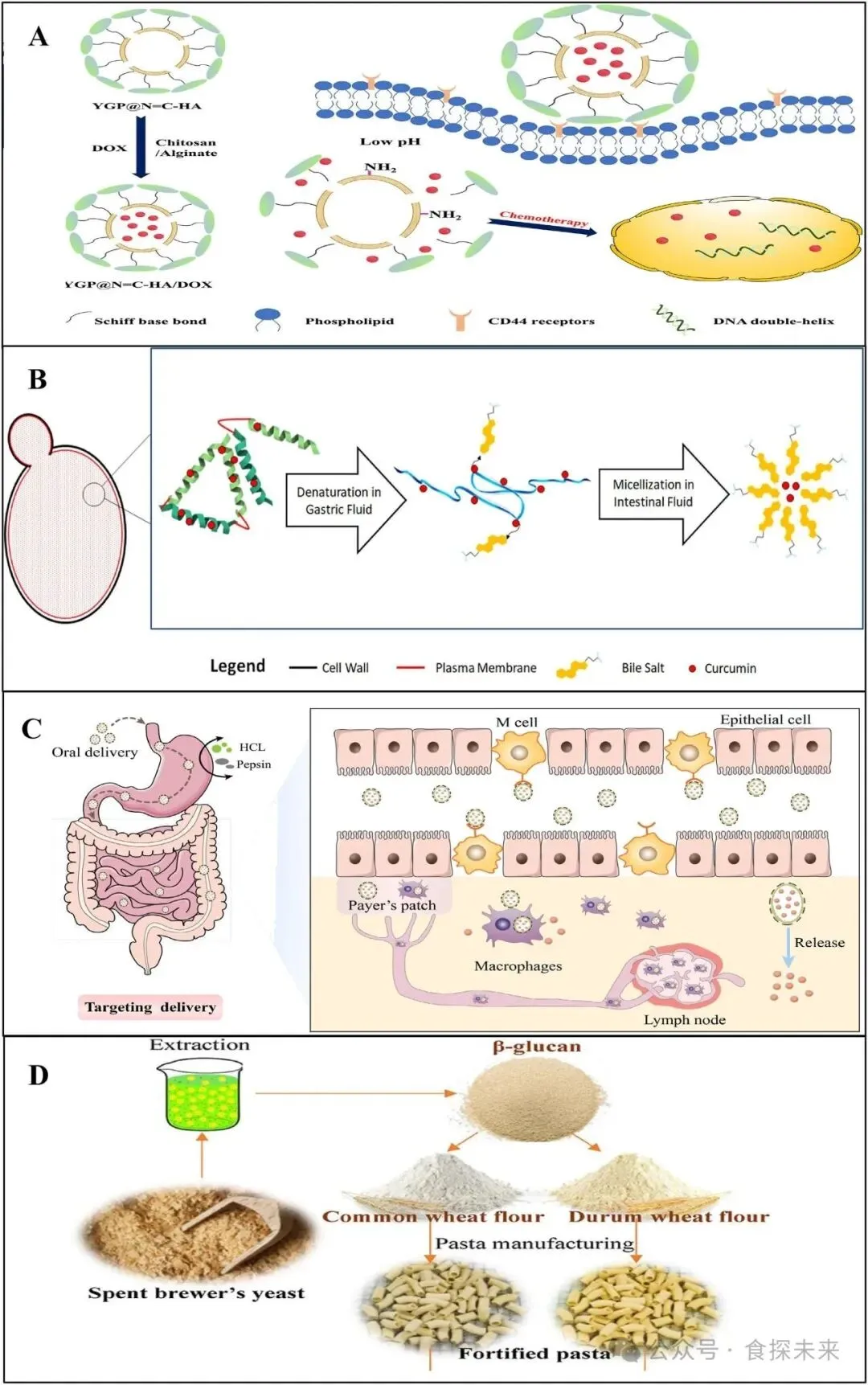 Fig. 3. (A) Schematic diagram of the preparation process of YGP@N=C-HA/DOX and the cell uptake mediated by CD44 receptor (F. He et al., 2023); (B) The presence of acid during stomach digestion leads to the formation of curcumin-yeast complexes, which can improve their dissolution and micellization during the LBS phase of intestinal digestion (Young et al., 2019); (C) Yeast-based β-glucan specifically targets macrophages (Yang et al., 2023); (D) β-Glucan extracted from spent brewer's yeast (Ungureanu-Iuga & Avrămia, 2023).