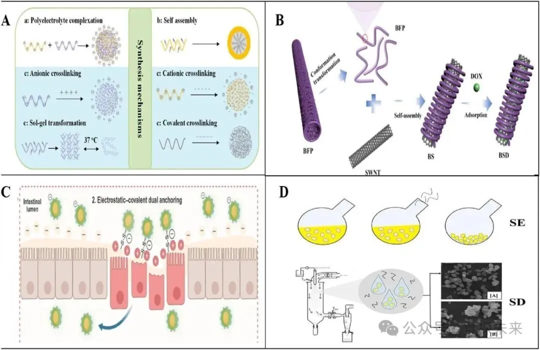 Fig. 4. (A) Schematic diagram of polysaccharide nanocarrier synthesis mechanisms (Tie & Tan, 2022); (B) β-Glucan self-assembly process (Cai et al., 2024); (C) After remaining stable in the gastric environment, it adheres to the inflamed intestinal sites through electrostatic interactions (J. Chen et al., 2025); (D) Schematic diagram of spray drying loading method (Šalamúnová et al., 2021).