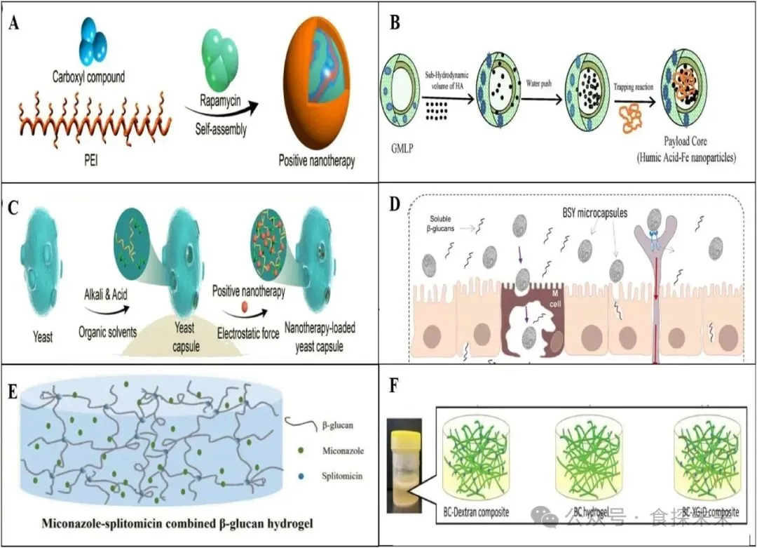 Fig. 5. (A) Nanotherapy delivered orally via yeast capsules (Wu et al., 2023); (B) Preparation process of yeast-based β-glucan nanoparticles (Hamza et al., 2018); (C) Self-assembly of positive microcapsules through yeast capsules (Wu et al., 2023); (D) Preparation process of yeast-based β-glucan microcapsules (Reis et al., 2023); (E) Miconazole-Pleuromutilin combined β-glucan hydrogel (M. Wang et al., 2024); (F) Preparation Process of Cellulose-Xyloglucan-Dextran Hydrogel (S.-Q. Chen et al., 2023).