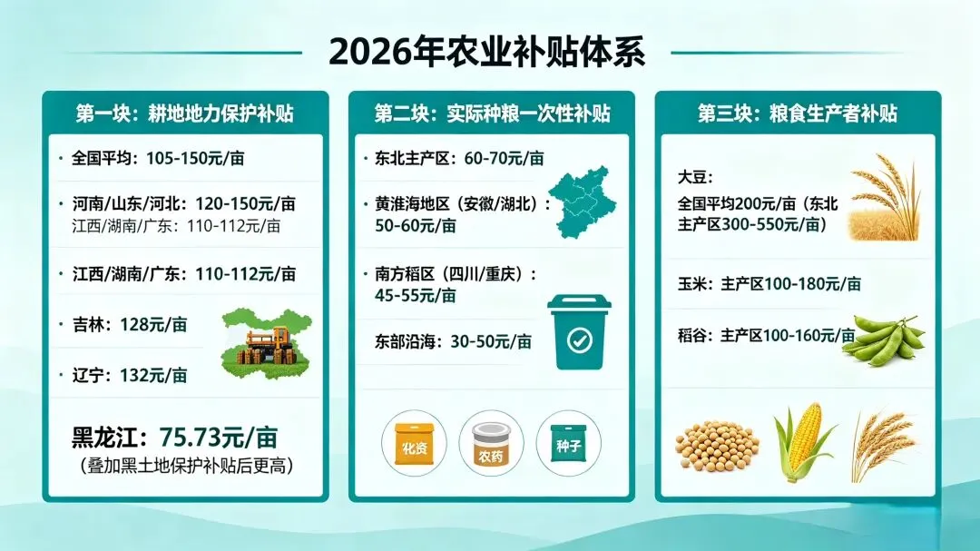- 黑龙江:75.73元/亩(叠加黑土地保护补贴后更高)