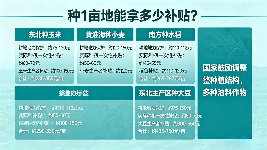 看到没?种大豆的补贴明显高出一大截!这就是国家在鼓励咱调整种植结构,多种油料作物。