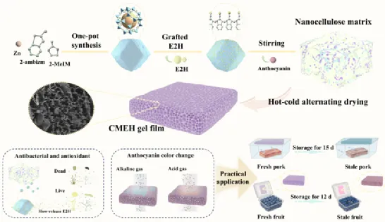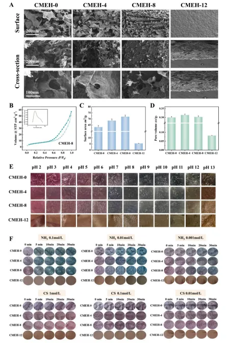 通过SEM、比表面积/孔隙率测试、FT-IR、XRD、XPS、膜通透性、胞内物质释放、脂质过氧化、生物膜活性、BET及pH/气体显色实验综合证实,以纳米纤维素为基材,依次负载 ZIF-8-NH₂@E2H复合保鲜剂与花青素,经冷热交替干燥成功制备了CMEH智能凝胶膜;该膜形成均匀连续的三维多孔网络结构,各组分通过氢键与共价键稳定复合,兼具高孔隙率、高比表面积与优异结构稳定性;其中预干燥8 h制备的CMEH-8样品结构最优,对pH 2~13及不同浓度酸碱挥发物的显色响应最灵敏,可通过多途径协同发挥强效抗菌作用:破坏细菌细胞膜、引发脂质过氧化、诱导胞内蛋白质与核酸泄露、造成酶与 DNA/RNA 损伤、抑制生物膜形成,对大肠杆菌和金黄色葡萄球菌均展现出高效杀灭能力,为后续果蔬与肉类的保鲜及实时品质监测应用奠定了坚实的材料基础。