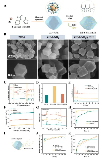 通过SEM、FTIR、Zeta电位、XRD、BET、XPS及体外释放实验可知,以锌源、2-ambzim、2-MeIM为原料经一步法合成并接枝反-2-己烯醛(E2H),成功制备了ZIF-8-NH₂@E2H复合保鲜剂;该材料保持了ZIF-8的规则多面体形貌与完整晶体结构,表面成功引入氨基并接枝E2H,电位由负转正后略有回落,具备多孔结构与高比表面积,可实现E2H的长效可控缓释(168 h累积释放率约80%,远优于游离E2H的24 h暴释),释放行为符合一级动力学模型,为后续智能包装膜的制备提供了性能优异的功能组分。