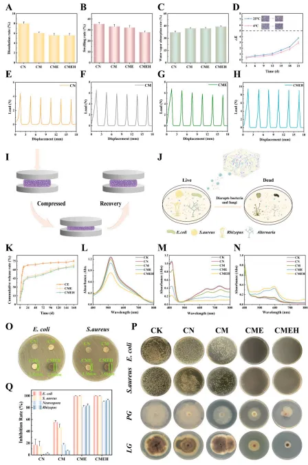 通过溶解率、溶胀率、水蒸气透过率、颜色稳定性、循环压缩力学测试、E2H释放实验、抗氧化实验及全谱抗菌实验综合证实,CMEH智能凝胶膜兼具优异的理化稳定性、力学回弹性、长效E2H控释性能、强抗氧化性与广谱抗菌活性,可高效杀灭食品常见腐败细菌与真菌,为果蔬与肉类的长效保鲜提供了性能全面的功能包装材料。