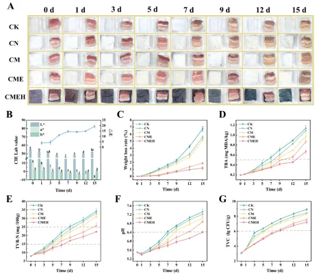 通过蓝莓(20℃)与猪肉(4℃)的双体系保鲜实验综合证实,CMEH 智能凝胶膜可同时适配果蔬与肉类的保鲜需求,实现长效保鲜与实时可视化监测的双重功能:在蓝莓保鲜中,该膜将常温货架期从6天显著延长至12天,有效抑制果实呼吸代谢、水分流失与腐烂,维持果霜完整性、硬度、可滴定酸与可溶性固形物含量,同时通过膜色变化精准反映腐败进程,GC-IMS分析证实其可完整保留蓝莓原有风味;在猪肉冷藏保鲜中,该膜将4℃食用期从不足5天延长至15天以上,显著抑制失重、脂肪氧化、蛋白质分解与菌落增殖,15天时 TVB-N、TBA、TVC等关键腐败指标均远低于安全限值,同时维持肉色红润新鲜。两类实验共同验证了CMEH凝胶膜的广谱保鲜性能与高灵敏监测能力,为生鲜食品的绿色智能包装提供了高效解决方案。