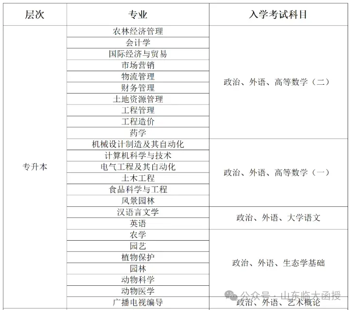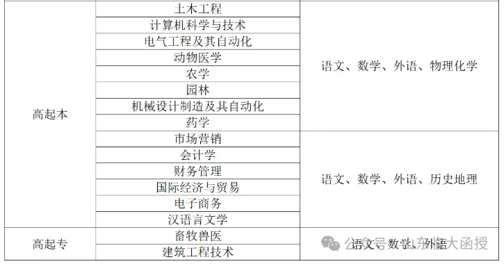 专升本:国际经济与贸易、汉语言文学、英语、机械设计制造及其自动化、电气工程及其自动化、计算机科学与技术、土木工程、食品科学与工程、风景园林、农学、园艺、植物保护、动物科学、动物医学、园林、药学、工程管理、工程造价、市场营销、会计学、财务管理、农林经济管理、土地资源管理、物流管理、广播电视编导