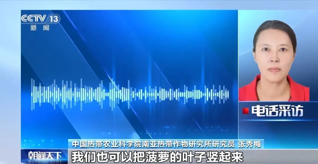 中国热带农业科学院南亚热带作物研究所研究员 张秀梅:首先是采取果实防晒,比如说套双层袋、防晒膜或者盖防晒布或者遮阴网。我们也可以把菠萝的叶子竖起来,起到防晒的作用。