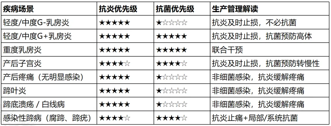 对炎性疾病一定要优先抗炎,稳住奶牛的采食、休息和挤奶等关键状态,是及时止损、保留治疗决策空间的关键;抗菌则聚焦长期风险控制。二者分工协同,而非对立。