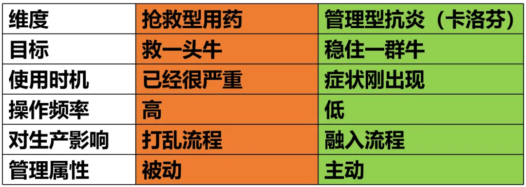 4、卡洛芬的真正定位:卡洛芬不是用来抢救濒死或濒淘的奶牛的。它真正的作用是稳住奶牛的状态:稳住采食、稳住休息、稳住挤奶、稳住短期产量和留群概率。卡洛芬是用于群体管理的抗炎工具,而不是单头危重牛的急救针。