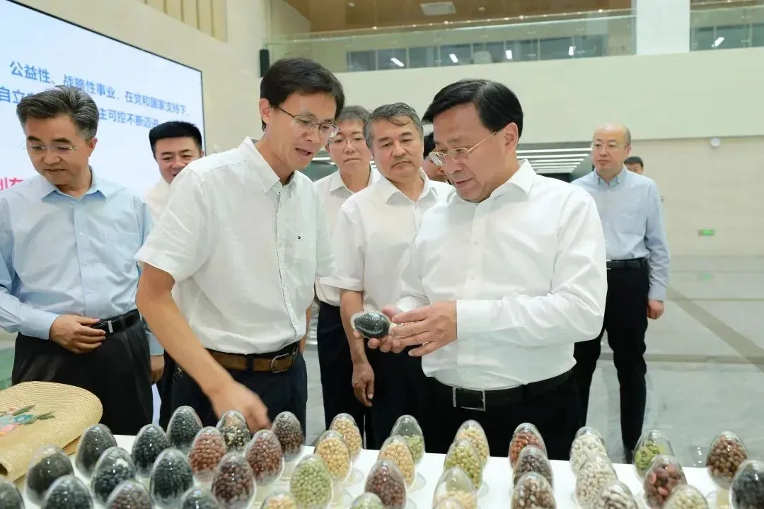 国家农作物种质资源库新库是我国农作物种质资源的战略保存中心,收集保存农作物种质资源56万余份,居世界第二位。韩俊认真查看野生大豆、水稻等种质资源样本,走进资源保存库,了解种质资源收集、保存及利用情况。他强调,农作物种质资源是国家战略性资源,事关种业振兴全局,要在持续做好资源普查、收集保护等工作基础上,用好高通量作物表型性状鉴定评价等现代技术手段,挖掘优异功能基因,加快商业化育种步伐,做到保护好、用得上,切实把资源优势转化为创新优势、产业优势,加快实现种业科技自立自强。