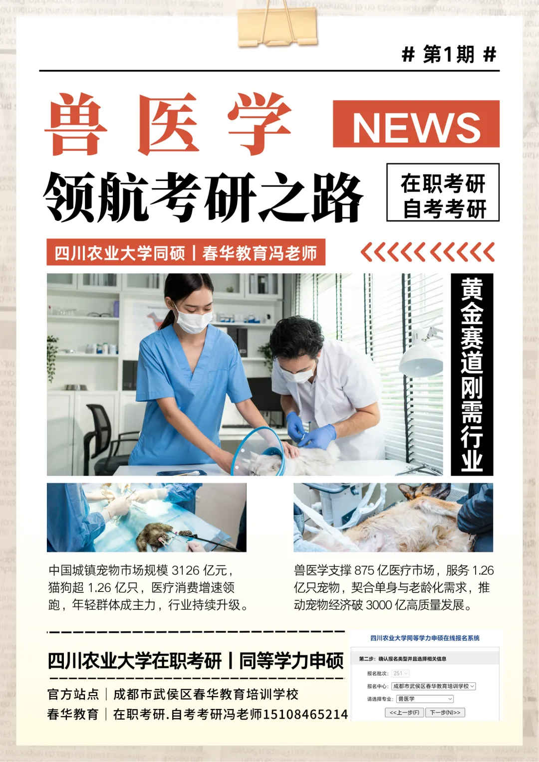 四川农业大学为国家 “211 工程” 高校,学科实力雄厚,兽医学为国家级重点学科,软科排名稳居全国前列,拥有博士点、博士后科研流动站及多个省部级重点实验室,科研平台完善。同等学力申硕免试入学,学习方式灵活,适合在职人员提升学历。专业紧贴宠物医疗、动物疫病防控等热门领域,契合 3000 亿级宠物经济发展需求,就业与职业晋升竞争力强。证书认可度高,可用于评职称、考执业兽医等,性价比突出。