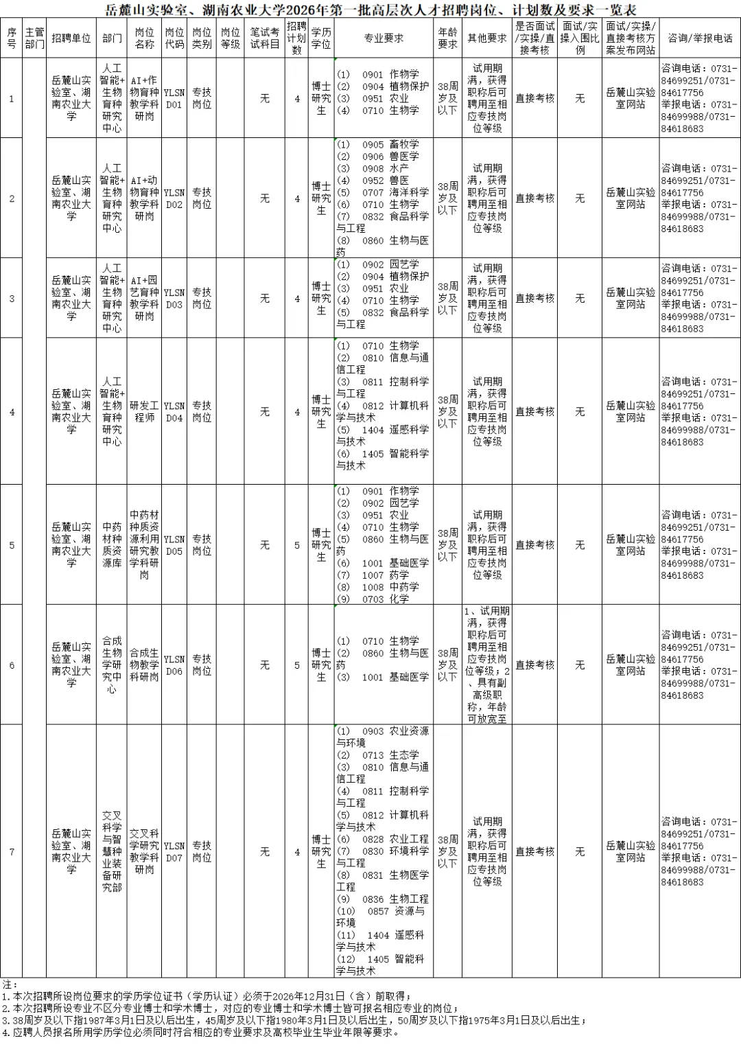 附件:1.岳麓山实验室、湖南农业大学2026年第一批高层次人才招聘岗位、计划数及要求一览表