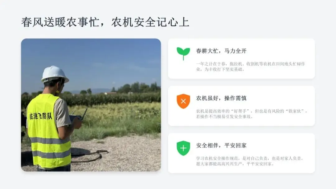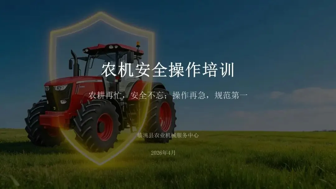 当前春耕生产全面铺开,农机下地作业、道路转运频次增多,拖拉机、收割机、植保机械投入农事生产,作业环境复杂,安全隐患随之增多。为进一步筑牢全县农机安全生产防线,压实农机作业安全责任,切实增强广大农机操作人员安全防范意识、规范操作技能,临洮县农业机械化学校精心整理编制2026年度农机安全生产安全教育培训课件。