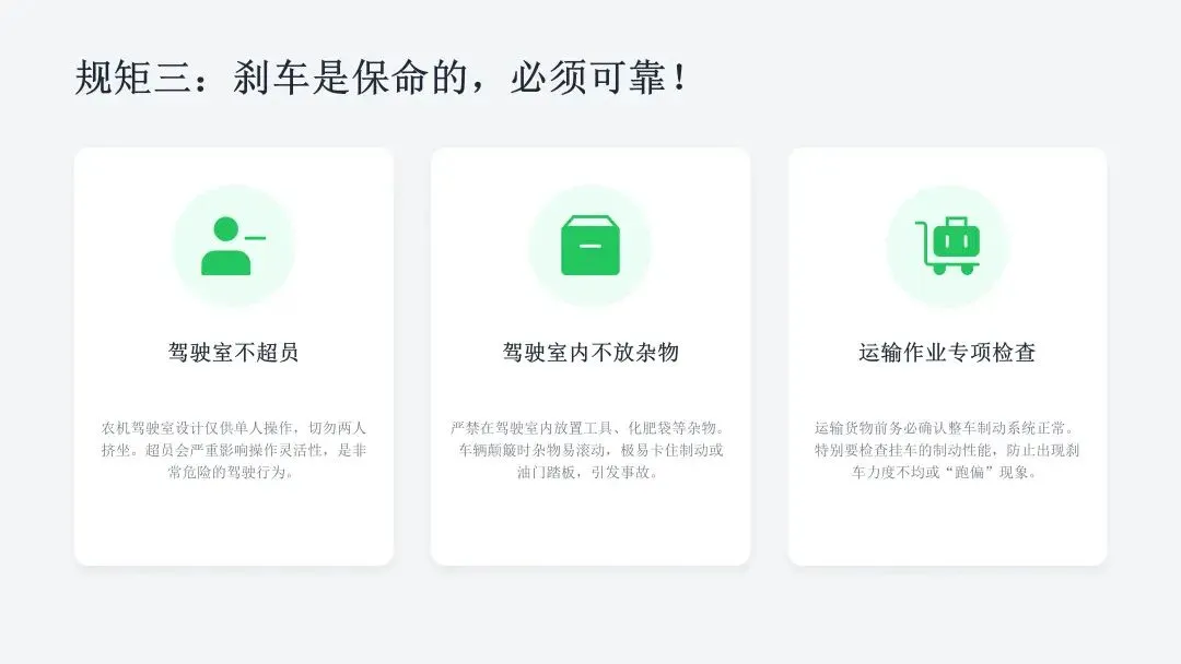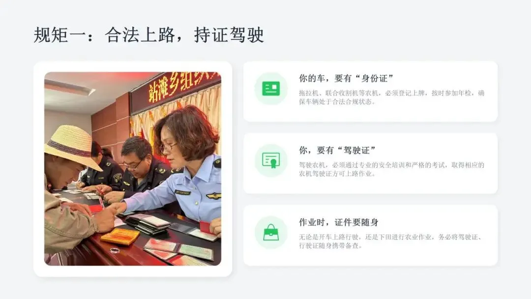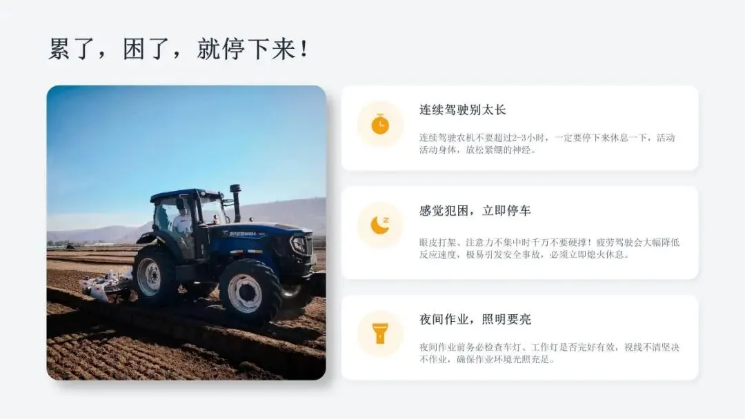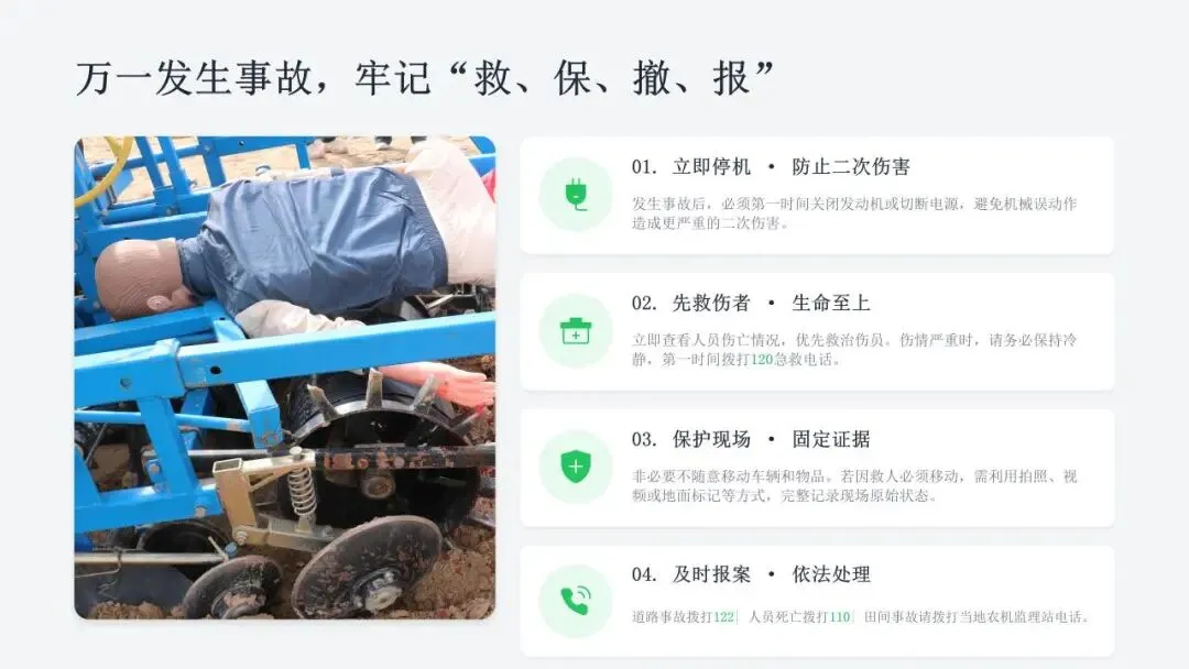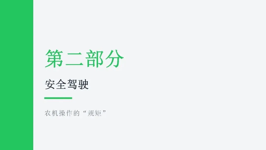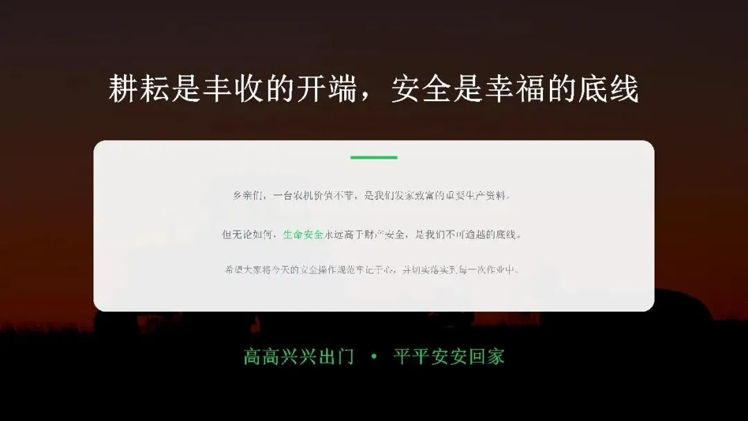 希望广大农机从业人员认真学习课件内容,牢固树立安全作业、规范操作、珍爱生命的理念,自觉杜绝无证驾驶、违法载人、酒后操作、带病作业等违规行为,熟练掌握农机安全操作技巧,时刻绷紧安全生产这根弦,做到懂安全、守规矩、会操作。