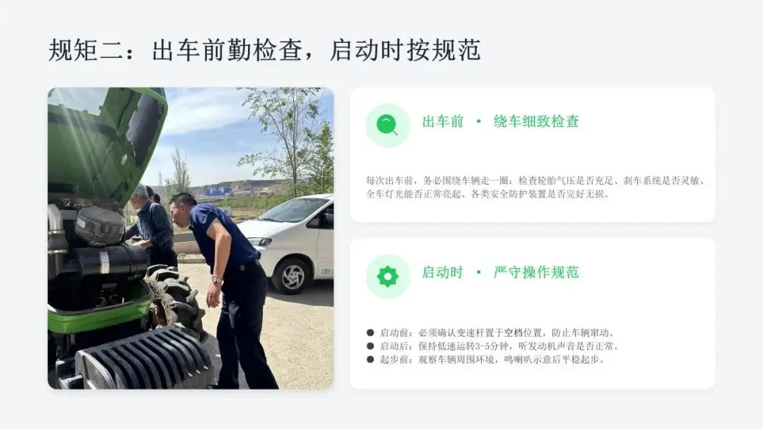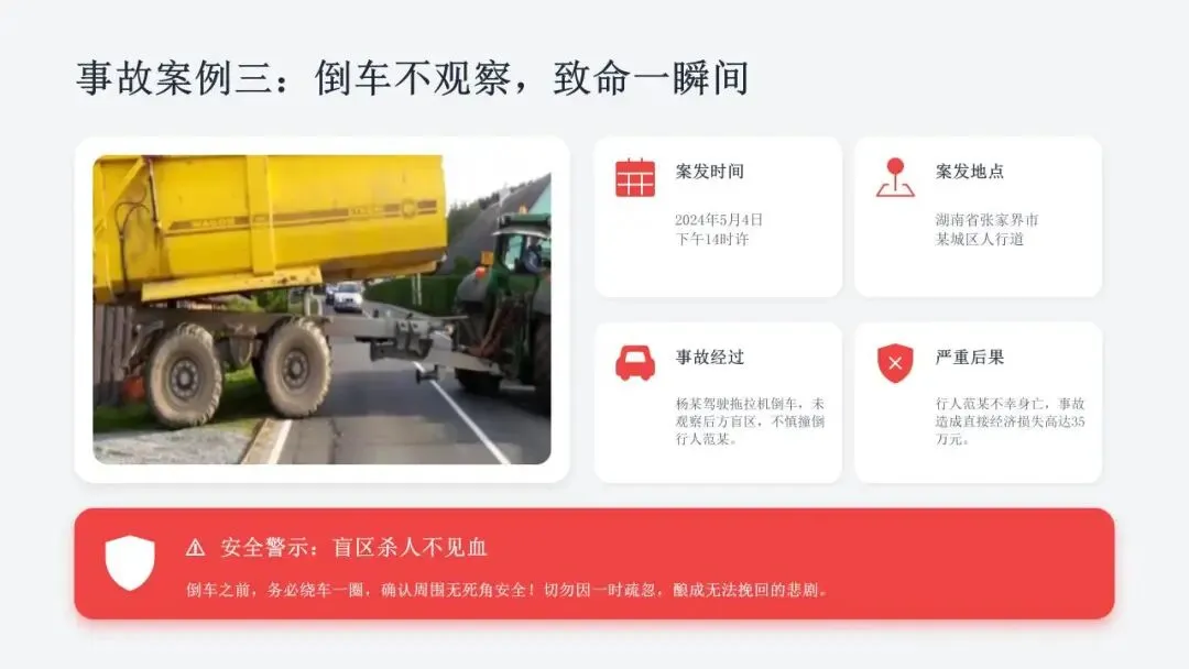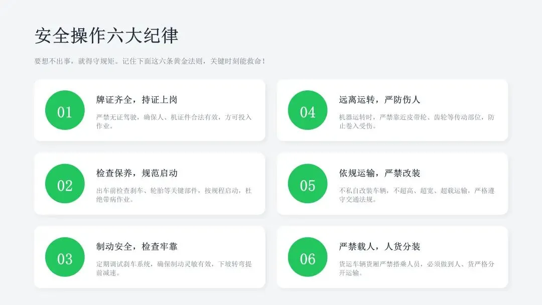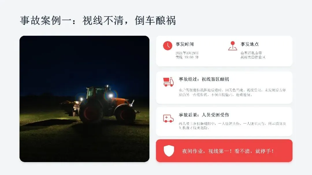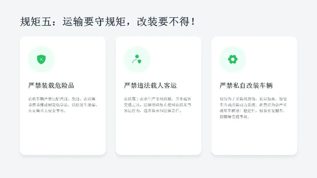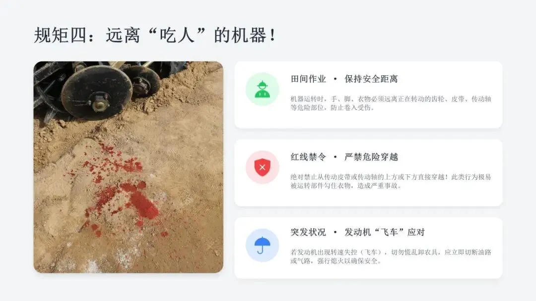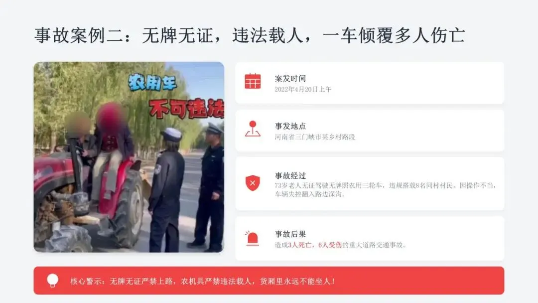 希望广大农机从业人员认真学习课件内容,牢固树立安全作业、规范操作、珍爱生命的理念,自觉杜绝无证驾驶、违法载人、酒后操作、带病作业等违规行为,熟练掌握农机安全操作技巧,时刻绷紧安全生产这根弦,做到懂安全、守规矩、会操作。