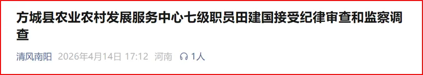 河南省方城县农业农村发展服务中心七级职员田建国,被查