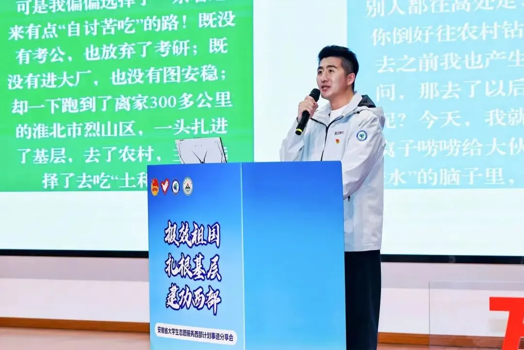 此次“报效祖国 扎根基层 建功西部”安徽省大学生志愿服务事迹分享会,旨在引导广大青年响应号召、踊跃加入西部计划志愿者队伍,扎根基层、服务乡村振兴,到祖国和人民最需要的地方建功立业。安徽农业大学将持续加强理想信念教育,引导青年学子把个人理想融入国家事业,以奋斗姿态投身基层实践,用青春书写无愧于时代的精彩华章。