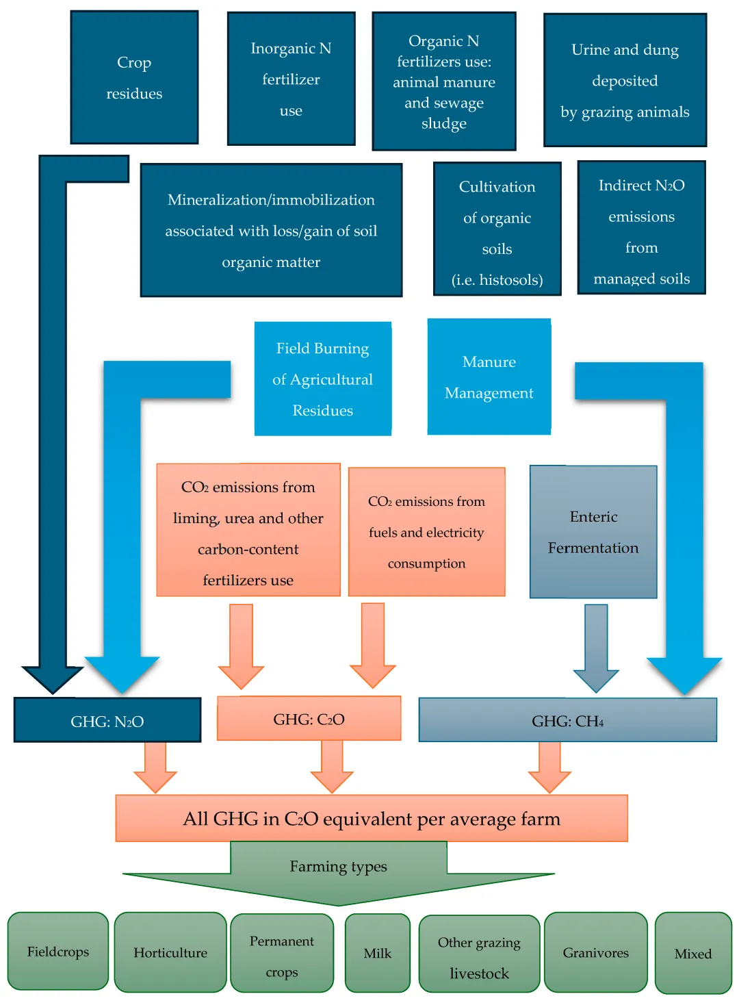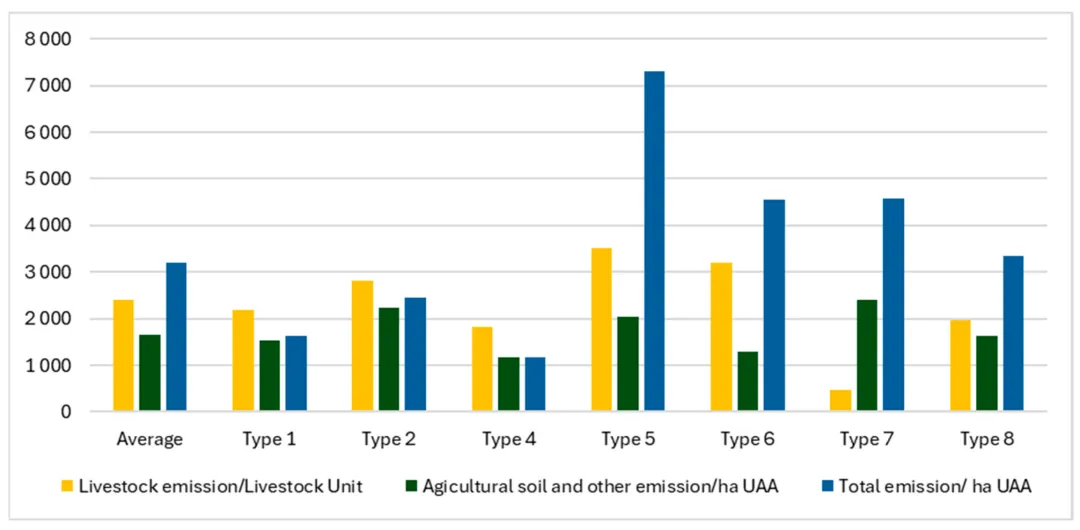 该研究团队对11,029个农场 (主要包括作物生产农场、混合型农场、牛奶生产农场) 进行了温室气体排放的估算,主要流程分为如下几个步骤。首先,计算农场中各项农业活动产生的排放。研究团队基于IPCC方法和FADN数据的范围,将温室气体排放来源划分为:畜牧来源排放 (肠道发酵过程的CH₄排放和粪肥管理过程的CH₄ (甲烷) 和N₂O (一氧化二氮) 排放)、土壤直接排放 (矿物肥料相关的排放等)、土壤间接排放 (大气氮挥发以及氮淋溶和径流)、田间焚烧农业残留物排放、燃料燃烧排放和电力消耗排放。接着,研究团队采用了多项假设和间接的估算方法进行数据处理,比如利用牲畜种群规模估算自然施肥量、利用氮肥市场销售份额计算尿素使用量,或利用农场能源消耗成本推算对应排放量。最后,研究团队进行了标准化汇总,将计算得到的各温室气体 (CO₂、CH₄、N₂O) 排放量统一折算为二氧化碳当量 (CO₂ eq),从而比较不同类型的农场排放量。