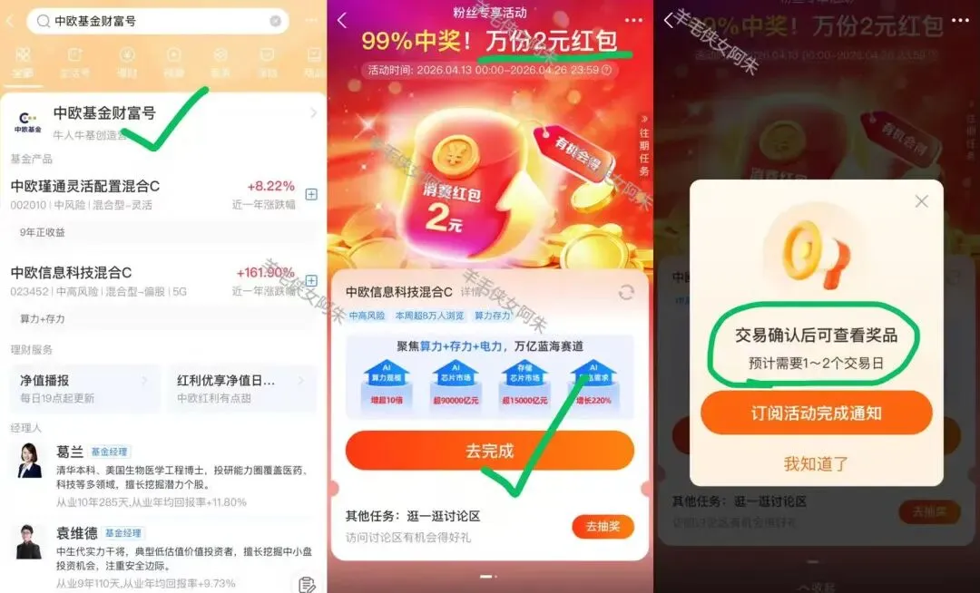 路径:支付宝App--搜:中欧基金,如图,粉丝专享活动,然后去完成任务