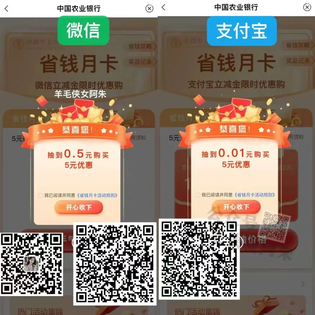 农行支付宝、微信省钱月卡有了