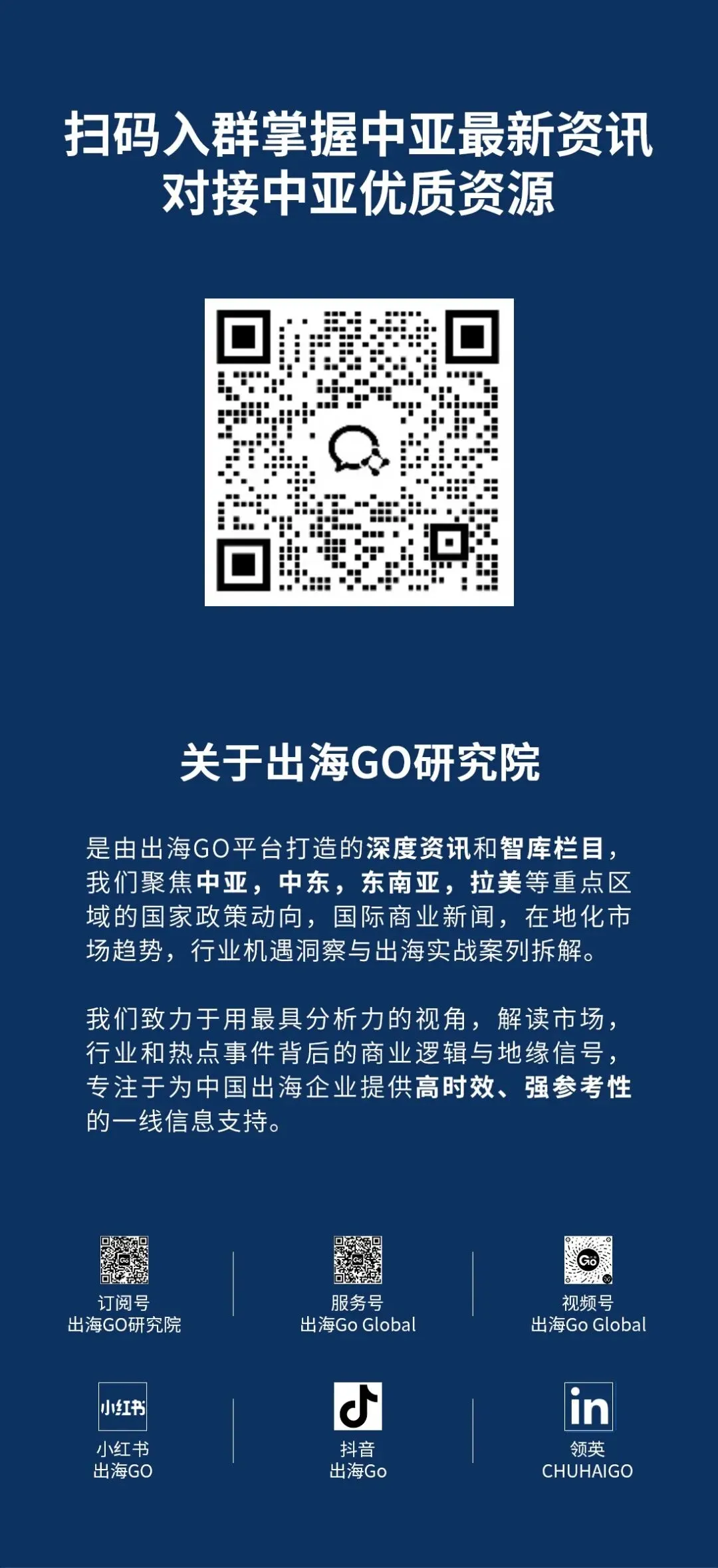 出海GO将持续更新中亚五国宏观经济、政策变化、市场洞察与行业趋势等相关资讯,并依托权威一手信息渠道、本地化政商资源与深度行业数据库,助力中国企业高效布局、稳健掘金中亚市场。