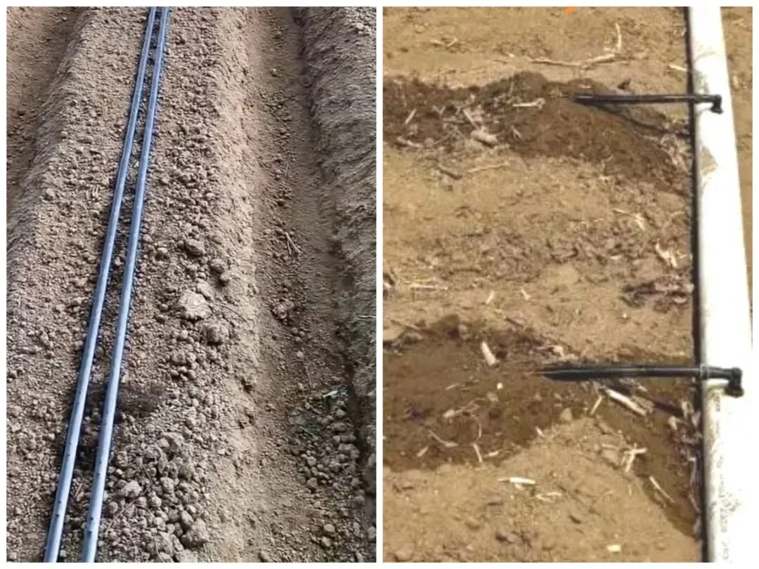 图1 浅埋滴灌直观图滴灌带可以浅埋,但不是埋在土里就行那么简单。需控制埋深和注意铺设细节。