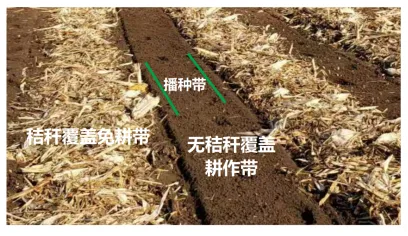 条耕机作业会形成一条无秸秆覆盖的播种带和一条秸秆带。条带宽度依据条耕机机械参数和本地常用行距设定。